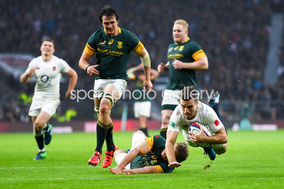 Flyhalf George Ford of England dives to score his team's third try during the Old Mutual Wealth Series match between England and South Africa at Twickenham Stadium on November 12, 2016 in London, England. (Photo by Laurence Griffiths/Getty Images) Code: 622840518