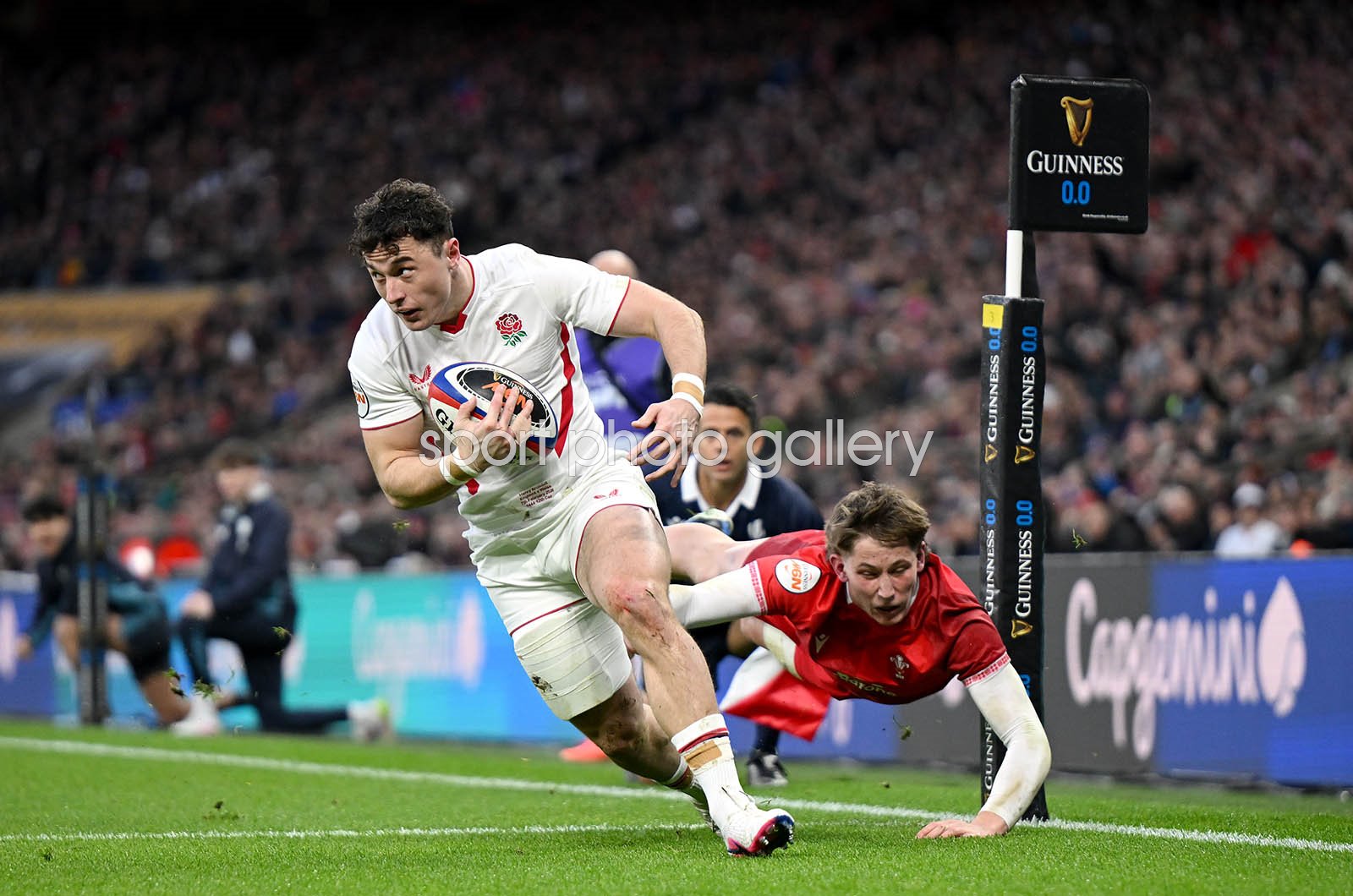 Henry Arundell of England avoids a tackle from Ellis Mee of Wales to go on and score his team's first try during the Guinness Six Nations 2026 match between England and Wales at Allianz Stadium on February 07, 2026 in London, England. (Photo by Mike Hewitt/Getty Images)