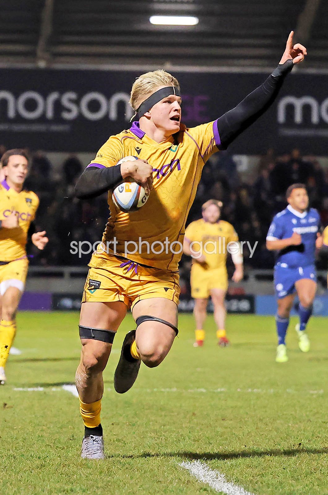 Henry Pollock of Northampton Saints celebrates as he runs in to score their final try during the Gallagher PREM match between Sale Sharks and Northampton Saints at CorpAcq Stadium on January 24, 2026 in Salford, England. (Photo by David Rogers/Getty Images)