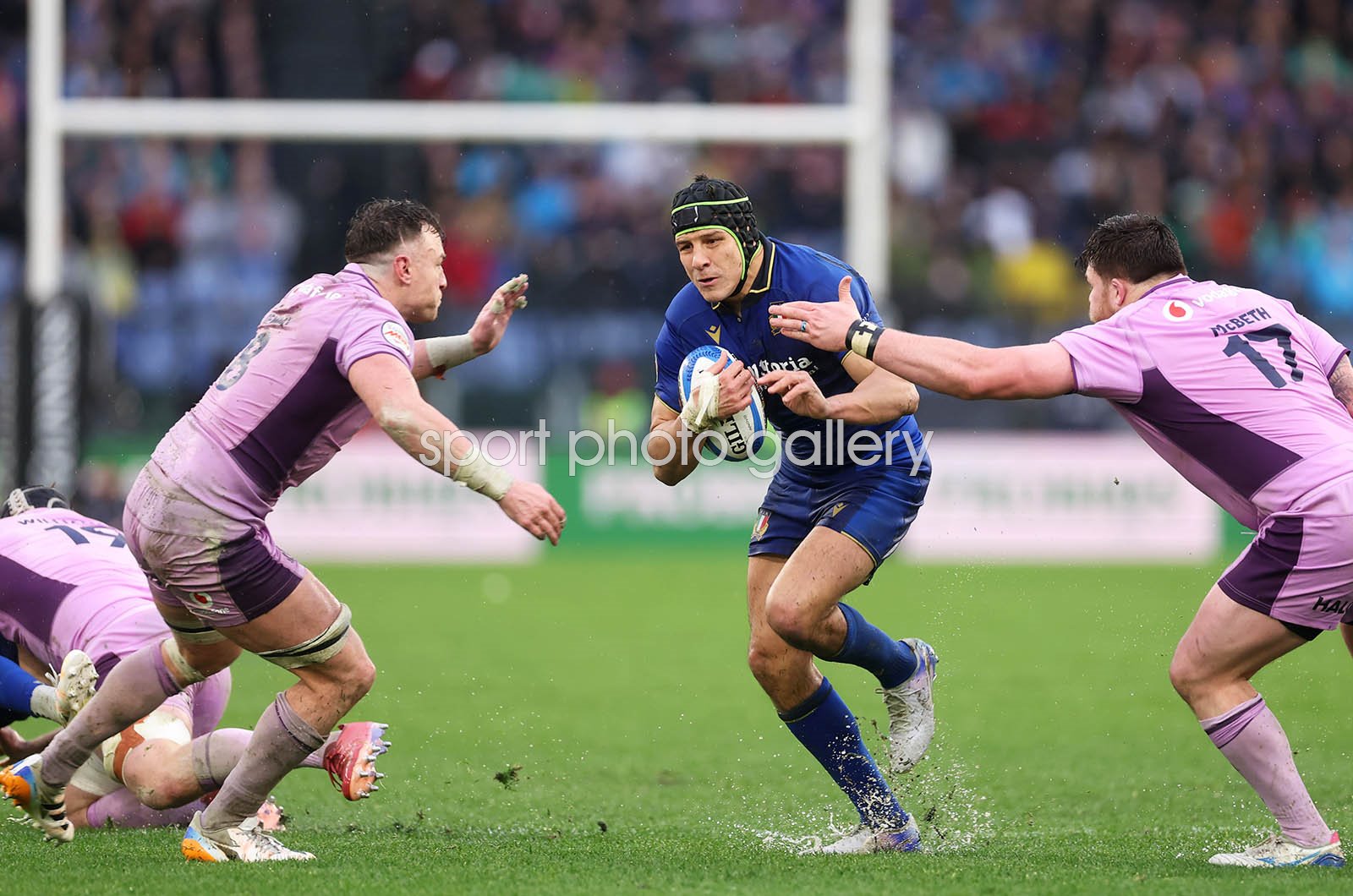 Juan Ignacio Brex of Italy breaks with the ball whilst under pressure from Jack Dempsey and Nathan McBeth of Scotland during the Guinness Six Nations 2026 match between Italy and Scotland at Stadio Olimpico on February 07, 2026 in Rome, Italy. (Photo by Warren Little/Getty Images)