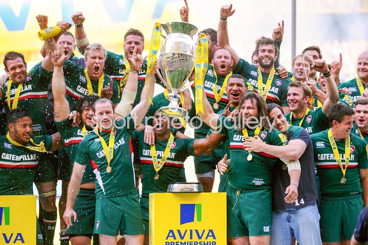 Geordan Murphy and Martin Castrogiovanni of Leicester lift the trophy following their team's 37 - 17 victory in the Aviva Premiership Final between Leicester Tigers and Northampton Saints at Twickenham Stadium on May 25, 2013 in London, England. (Photo by Mike Hewitt/Getty Images)