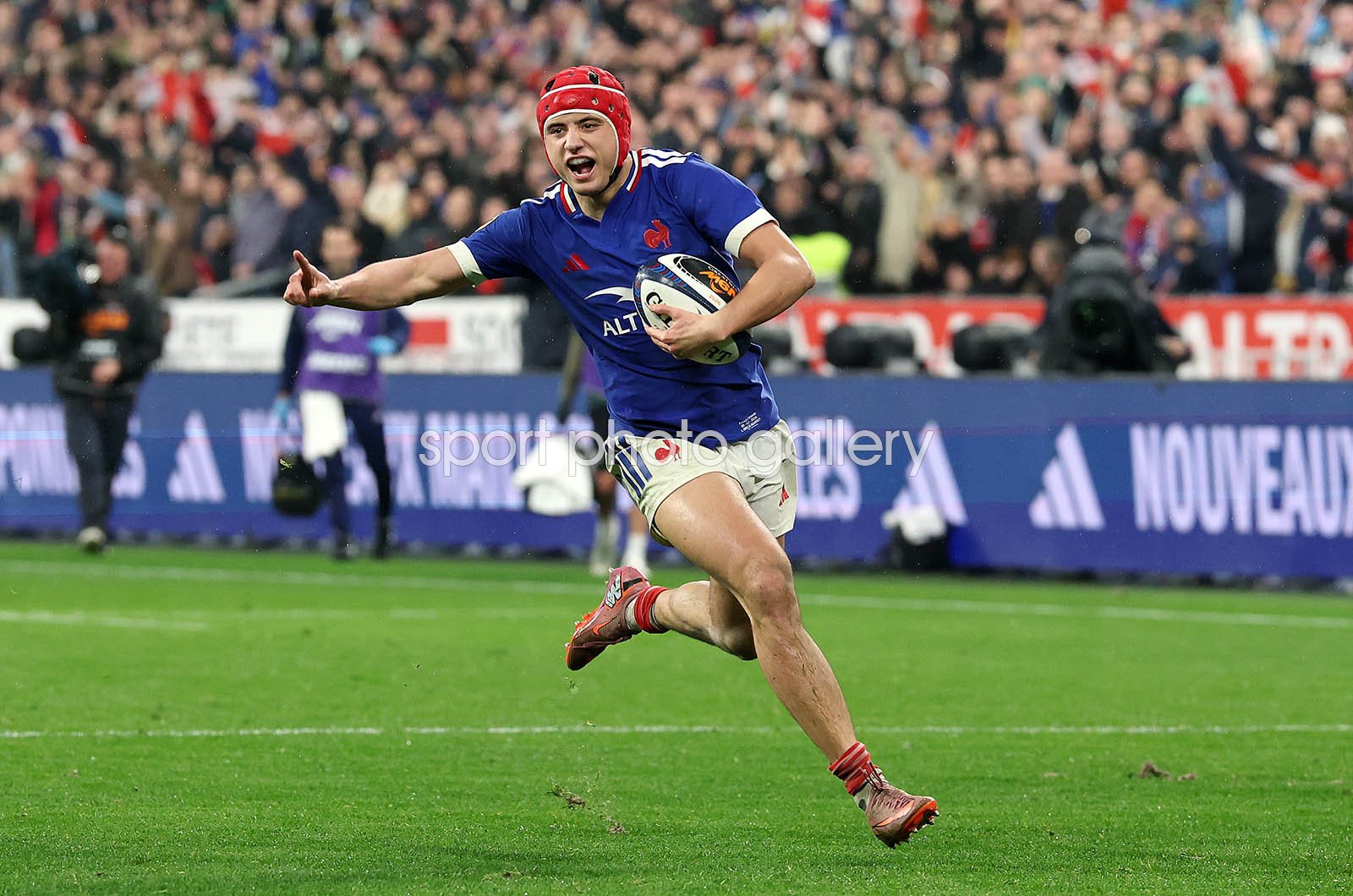 Louis Bielle-Biarrey of France celebrates as he runs in to score his team's fourth try during the Guinness Six Nations 2026 match between France and Ireland at Stade de France on February 05, 2026 in Paris, France. (Photo by David Rogers/Getty Images) Code: 2260112846
