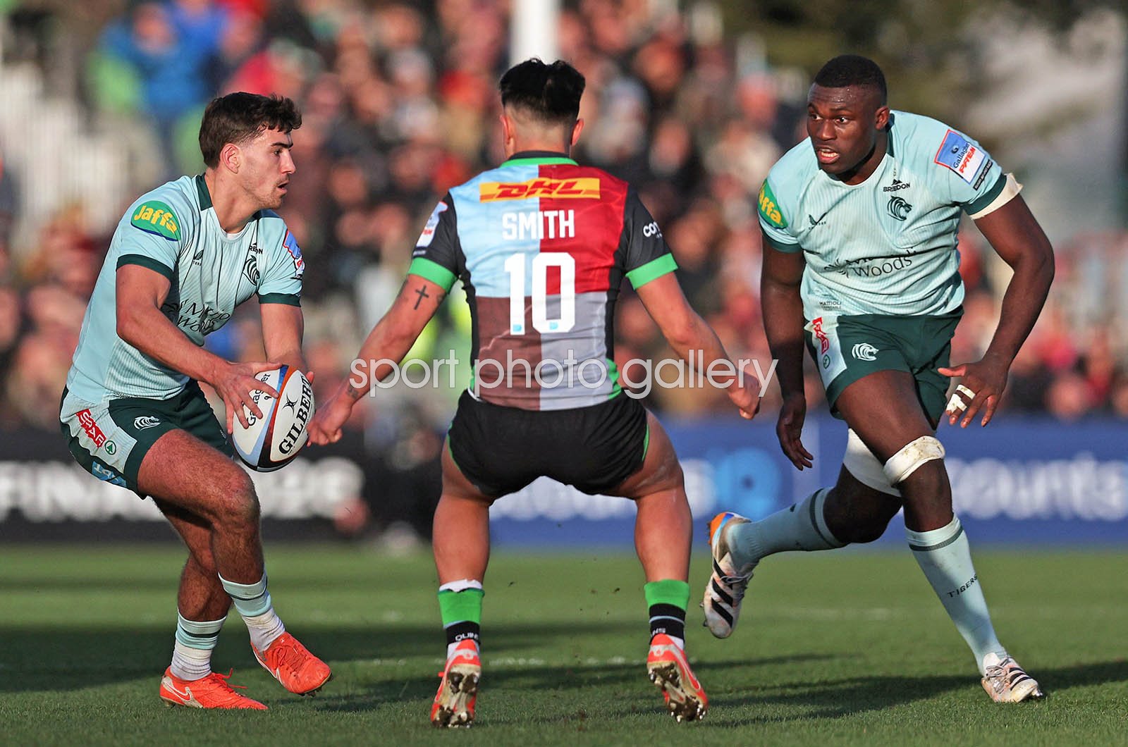 Orlando Bailey of Leicester Tigers passes the ball whilst under pressure from Marcus Smith of of Harlequins during the Gallagher PREM match between Harlequins and Leicester Tigers at The Stoop on January 24, 2026 in London, England. (Photo by Steve Bardens/Getty Images)