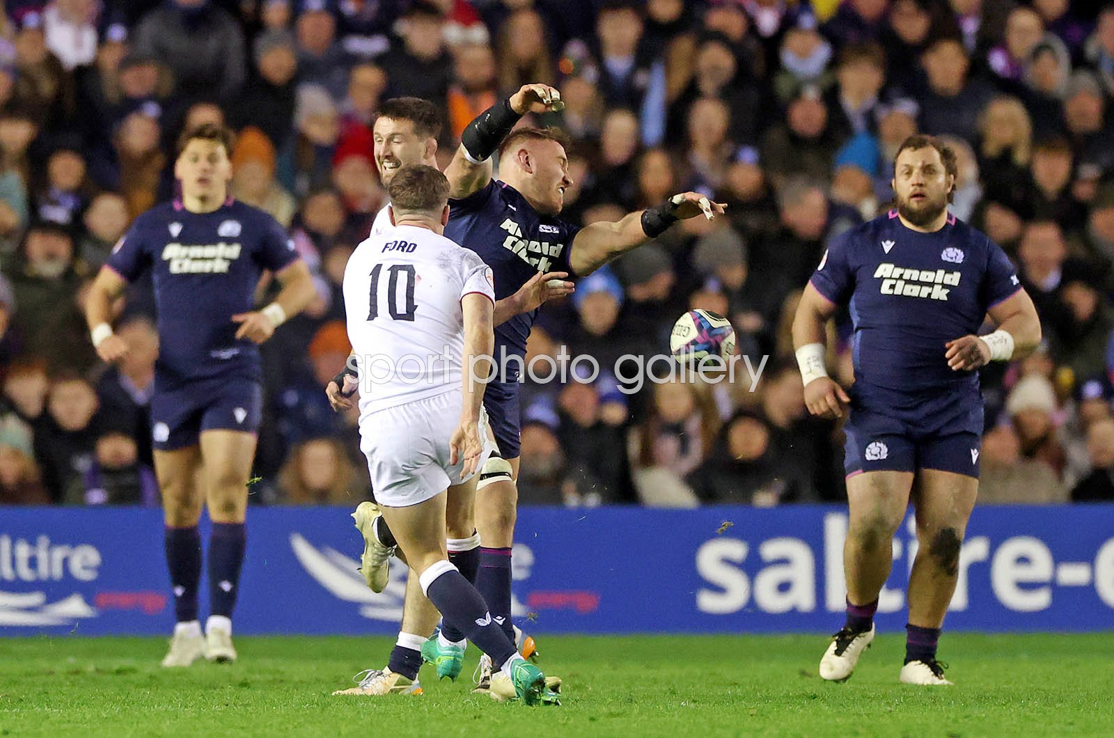Matt Fagerson of Scotland charges down George Ford of England's attempted drop goal which results in Huw Jones of Scotland (not pictured) scores his team's fourth try during the Guinness Six Nations 2026 match between Scotland and England at Scottish Gas Murrayfield on February 14, 2026 in Edinburgh, Scotland. (Photo by David Rogers/Getty Images)