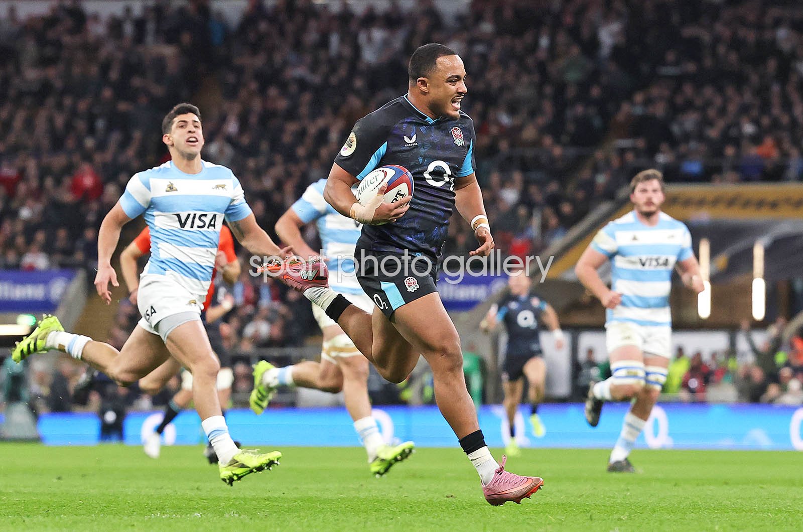 Max Ojomoh of England breaks clear to score their first try during the Quilter Nations Series 2025 rugby international match between England and Argentina at Allianz Stadium on November 23, 2025 in London, England. (Photo by David Rogers/Getty Images)