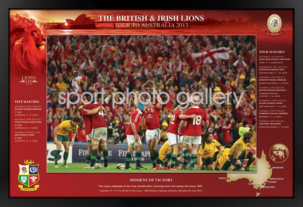 As with all of our licensed Lions product the print only option and fully framed option come complete with stunning 2013 Lions artwork together with all the tour information - venues, match scores and dates.