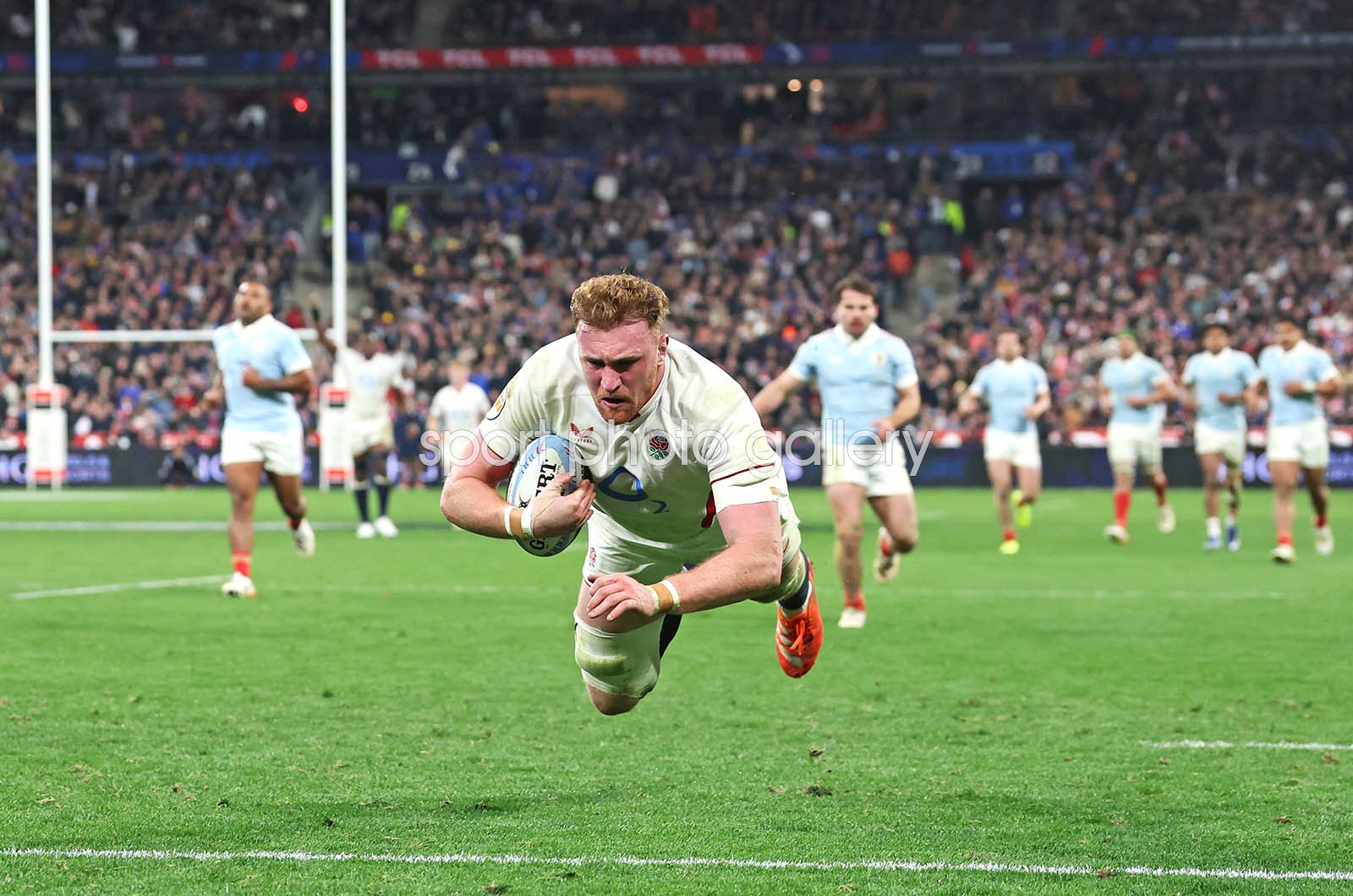 Ollie Chessum of England dives in to scores his team's fifth try during the Guinness Six Nations 2026 match between France and England at Stade de France on March 14, 2026 in Paris, France. (Photo by David Rogers/Getty Images) Code: 2266527071