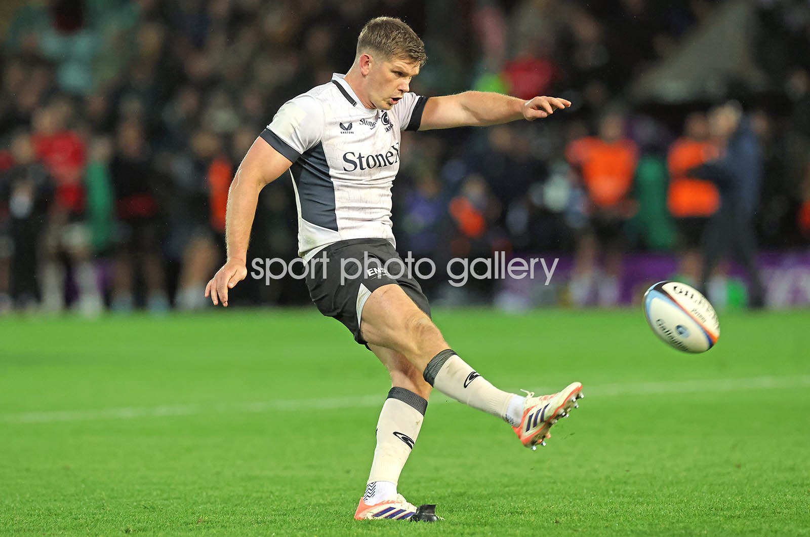 Owen Farrell of Saracens kicks a conversion during the Gallagher PREM match between Northampton Saints and Saracens at cinch Stadium at Franklin's Gardens on October 24, 2025 in Northampton, England. (Photo by David Rogers/Getty Images) Code: 2243108699