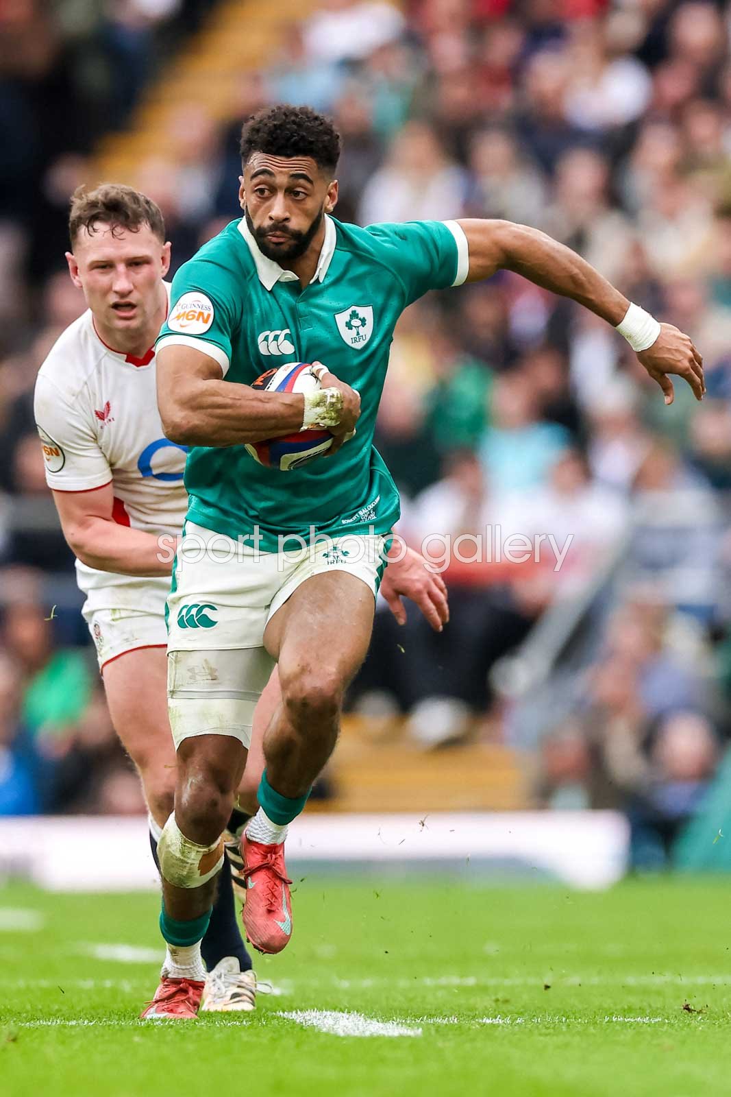 Robert Baloucoune of Ireland gets away from Fraser Dingwall during the Guinness Six Nations 2026 match between England and Ireland at Allianz Stadium on February 21, 2026 in London, England. (Photo by David Rogers/Getty Images) Code: 2263334706
