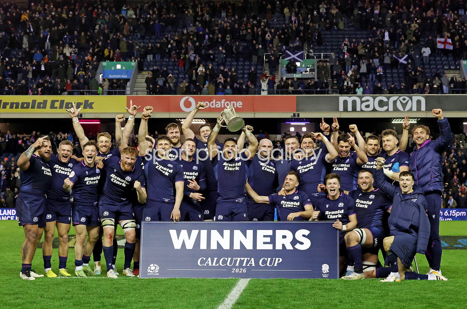 Players of Scotland celebrate as Sione Tuipulotu of Scotland lifts the Calcutta Cup following the Guinness Six Nations 2026 match between Scotland and England at Scottish Gas Murrayfield on February 14, 2026 in Edinburgh, Scotland. (Photo by David Rogers/Getty Images)