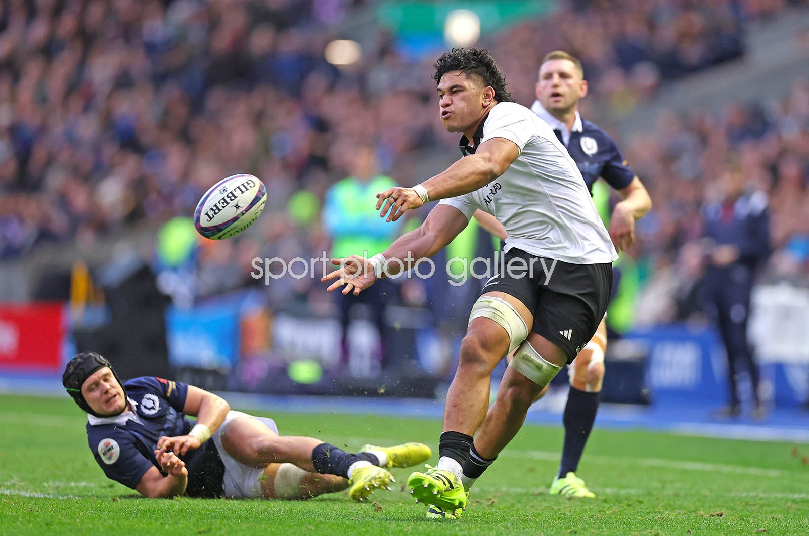 EDINBURGH, SCOTLAND - NOVEMBER 08: Wallace Sititi of New Zealand offloads to set up the second try during the Quilter Nations Series 2025 rugby international match between Scotland and New Zealand at the Scottish Gas Murrayfield on November 08, 2025 in Edinburgh, Scotland. (Photo by Stu Forster/Getty Images)