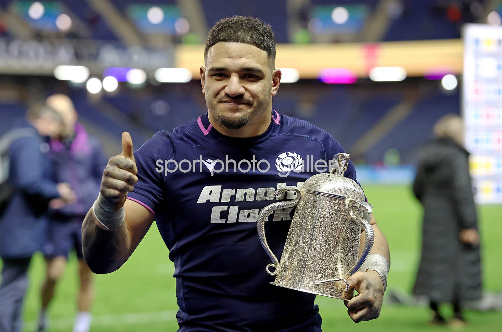 Sione Tuipulotu of Scotland poses for a photograph with the Calcutta Cup following the Guinness Six Nations 2026 match between Scotland and England at Scottish Gas Murrayfield on February 14, 2026 in Edinburgh, Scotland. (Photo by David Rogers/Getty Images)