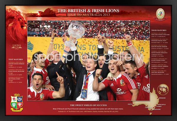 As with all of our licensed Lions product the print only option and fully framed option come complete with stunning 2013 Lions artwork together with all the tour information - venues, match scores and dates.