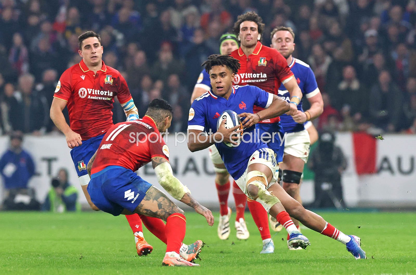 Theo Attissogbe of France runs with the ball whilst under pressure from Monty Ioane of Italy during the Guinness Six Nations 2026 match between France and Italy at Stade Pierre Mauroy on February 22, 2026 in Lille, France. (Photo by David Rogers/Getty Images)