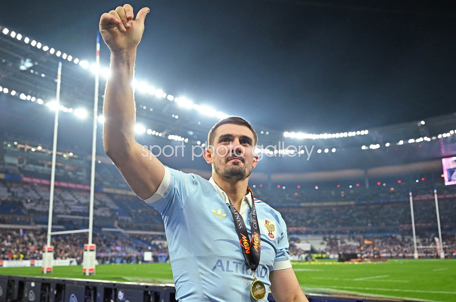 Thomas Ramos of France celebrates victory with his winners medal after the Guinness Six Nations 2026 match between France and England at Stade de France on March 14, 2026 in Paris, France. (Photo by Shaun Botterill/Getty Images) Code: 2266534645