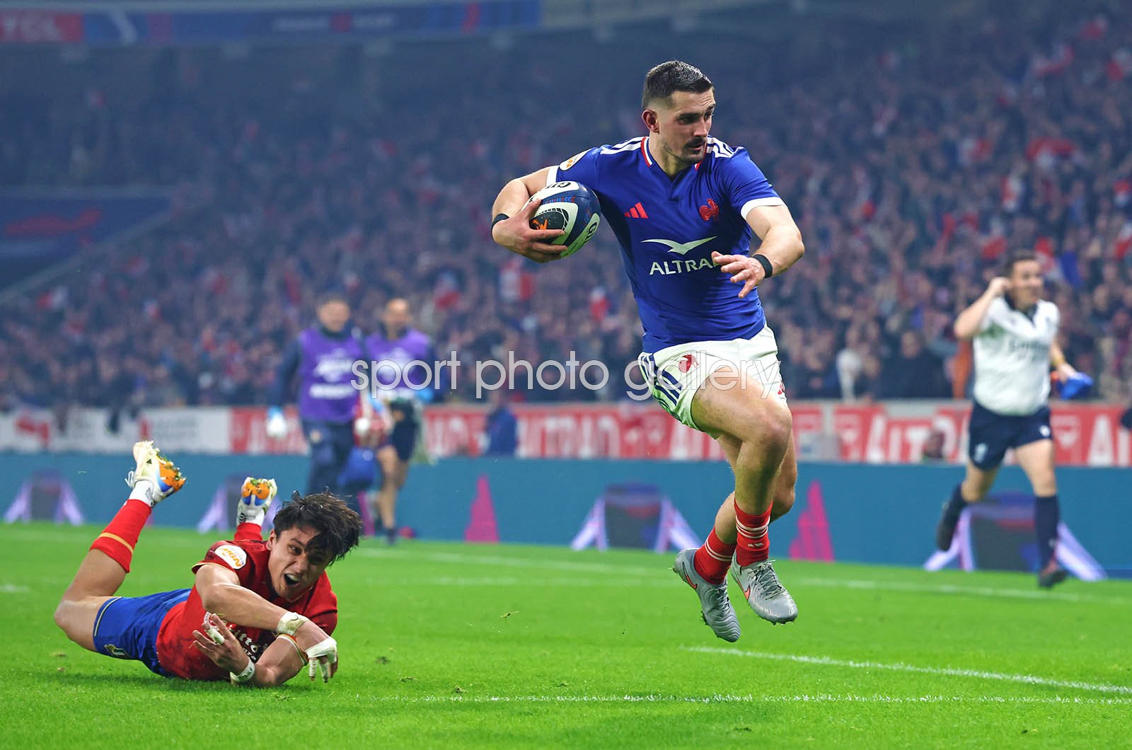 Thomas Ramos of France avoids a tackle form Ange Capuozzo of Italy to go on and score his teams third try during the Guinness Six Nations 2026 match between France and Italy at Stade Pierre Mauroy on February 22, 2026 in Lille, France. (Photo by David Rogers/Getty Images)