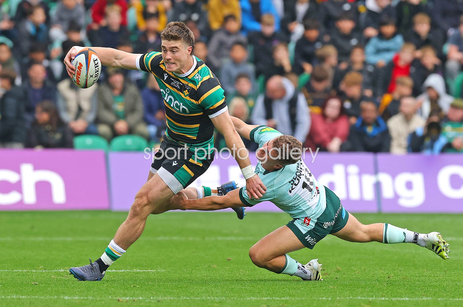 Tommy Freeman of Northampton Saints goes past Billy Searle during the Gallagher PREM match between Northampton Saints and Leicester Tigers at cinch Stadium at Franklin's Gardens on October 11, 2025 in Northampton, England. (Photo by David Rogers/Getty Images)
