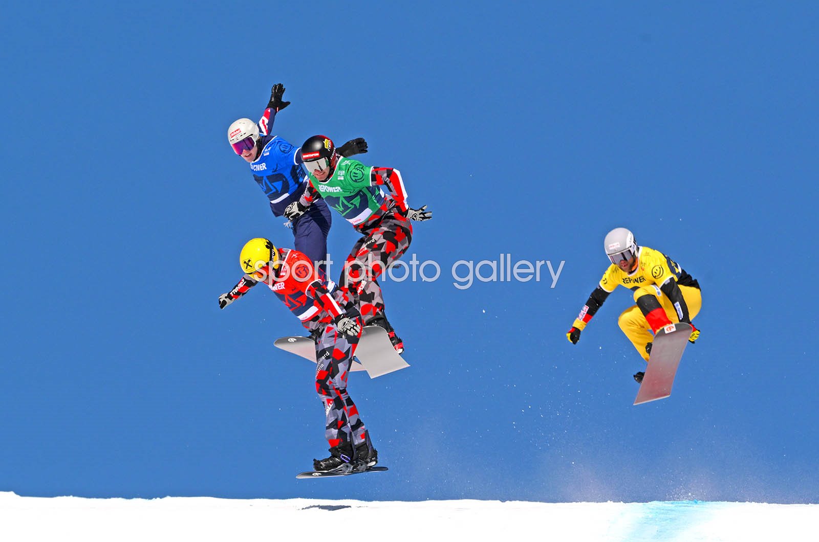 Jakob Dusek of Austria, Alessandro Haemmerle of Austria, Huw Nightingale of Great Britain and Martin Noerl of Germany compete during Men's Snowboard Cross Quarter Final 4 during Day 12 of the FIS Snowboard, Freestyle and Freeski World Championships 2025 on March 28, 2025 in Corviglia, St. Moritz, Switzerland. (Photo by David Ramos/Getty Images)