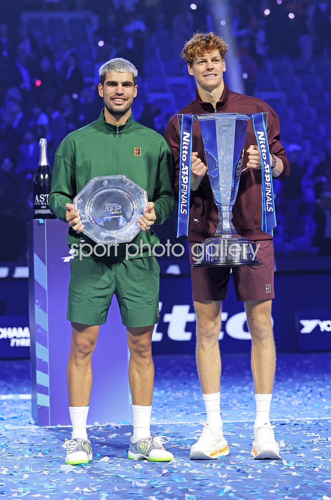 Winner Jannik Sinner of Italy poses for a photo with runner up Carlos Alcaraz of Spain following the Men's Singles Final on day eight of the Nitto ATP Finals 2025 at Inalpi Arena on November 16, 2025 in Turin, Italy. (Photo by Clive Brunskill/Getty Images)