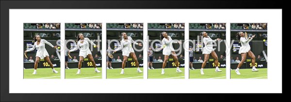 Serena Williams Forehand Action Sequence Collage - we are delighted to present this stunning action sequence of American tennis legend Serena Williams. Captured at the 2022 Wimbledon Tennis Championships, this action sequence perfectly captures the balance and power of her forehand technique - a big part of a game that has (as of Wimbledon 2022) captured 23 grand slam titles including 7 wins on the grass at SW19. The sequence is available as a single print with all the images in place or fully framed with each image individually window mounted - ready to hang on the wall.